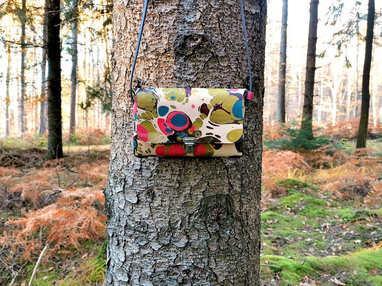 Crossbody Taschen in zwei Größen aus marmoriertem Leder mit uni Futter oder umgekehrt.