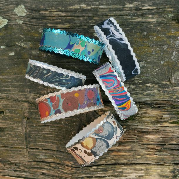 Ausgehend von der Technik des Marmorierens entwickeln wir Unikate auf den unterschiedlichsten Naturmaterialien wie Seide, Baumwolle, Wolle, Filz und Leder. Seit 2009 beschäftigen wir uns mit nachhaltigen und ökologischen Materialien, d.h. mit dem Marmorieren auf recyceltem und vegetabil gegerbtem Leder. Idee, Entwurf und Produktion von Einzelanfertigungen und Kleinserien liegen in unserer Hand. Unsere Produktpalette reicht von Leuchten bis hin zu Accessoires wie Taschen, Gürtel, Schals und Armbändern.