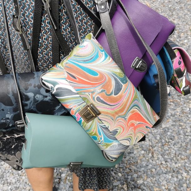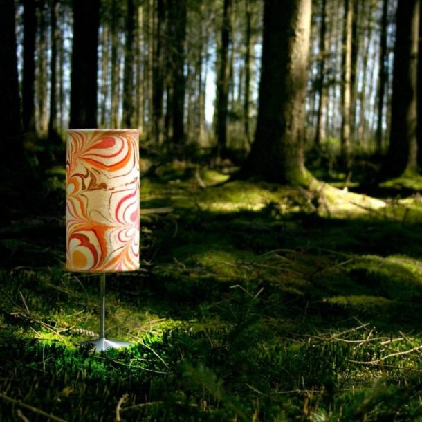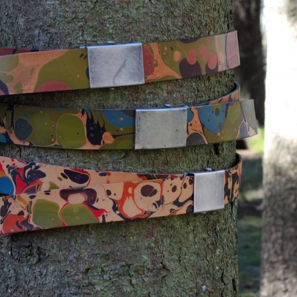 Ausgehend von der Technik des Marmorierens entwickeln wir Unikate auf den unterschiedlichsten Naturmaterialien wie Seide, Baumwolle, Wolle, Filz und Leder. Seit 2009 beschäftigen wir uns mit nachhaltigen und ökologischen Materialien, d.h. mit dem Marmorieren auf recyceltem und vegetabil gegerbtem Leder. Idee, Entwurf und Produktion von Einzelanfertigungen und Kleinserien liegen in unserer Hand. Unsere Produktpalette reicht von Leuchten bis hin zu Accessoires wie Taschen, Gürtel, Schals und Armbändern.
