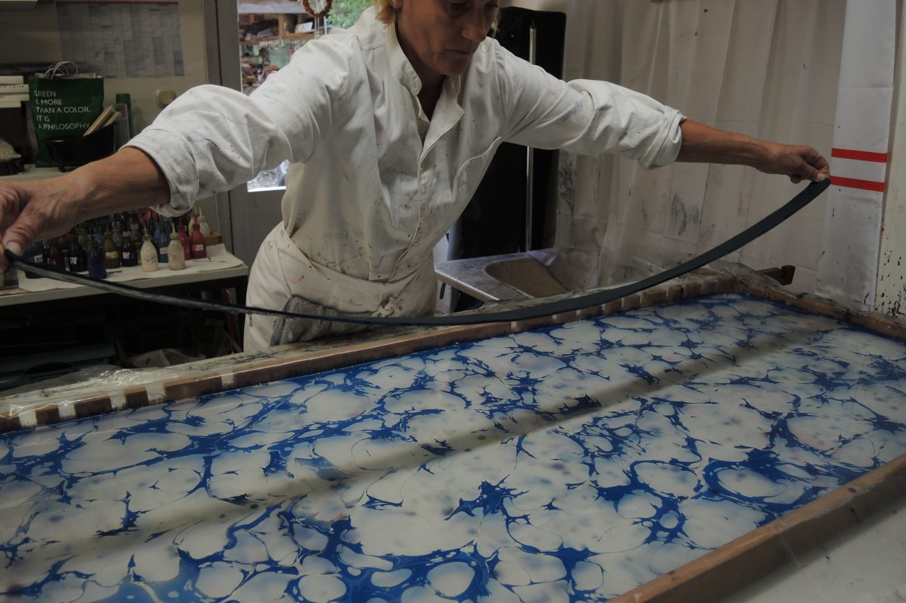 Hand in Hand zu arbeiten ist bei uns Voraussetzung, denn das Färben aller Materialien erfordert immer ein vierhändiges Arbeiten. Schon seit mehr als 30 Jahren arbeiten wir in einer kleinen Manufaktur rund um Farbe und Gestaltung und werden nicht müde, immer Neues zu probieren. Unsere Spezialisierung liegt im Marmorieren unterschiedlichster Basismaterialien. Neben vegetabil gegerbten Gürteln entwerfen wir Ledertaschen und Lederaccessoires wie Armbänder, Geldbörsen und Brillenetuis, Gürtel und Lampen aus Wollfilz und Schals aus Seide und Wolle. Wir verstehen uns ganz wesentlich als Handwerkerinnen, denn das Marmorieren ist eine sehr alte Färbetechnik, die, früher ein Meisterberuf war. Heute gibt es nur noch wenige, die dieses Handwerk beherrschen. Wir Beide gehören dazu! Den englischen Begriff für Marmor haben wir als „MM“ „Miss Marble“ in unser Label mm-unikat einfließen lassen.