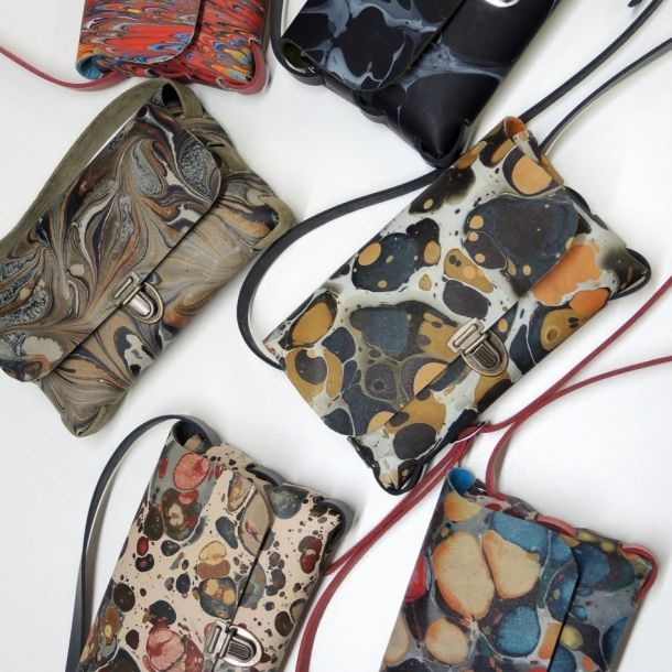 Crossbody Taschen in zwei Größen aus marmoriertem Leder mit uni Futter oder umgekehrt.